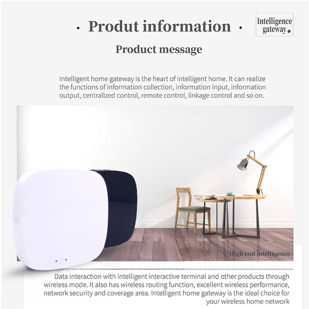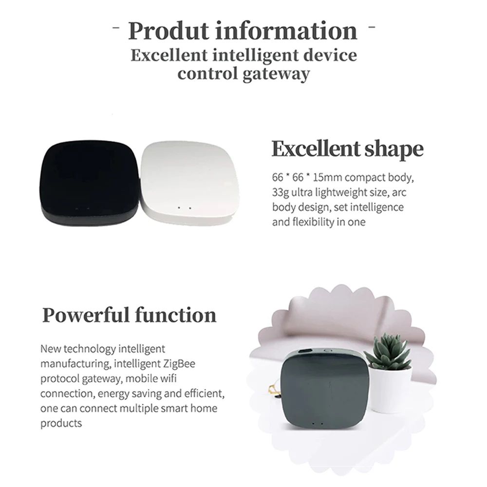 1.Fácil de configurar y usar: no es necesario conectarse al cable de red, simplemente encienda este concentrador de puerta de enlace inteligente y conéctelo con la aplicación Smart Life.En varios minutos, obtendrá una automatización del hogar inteligente.