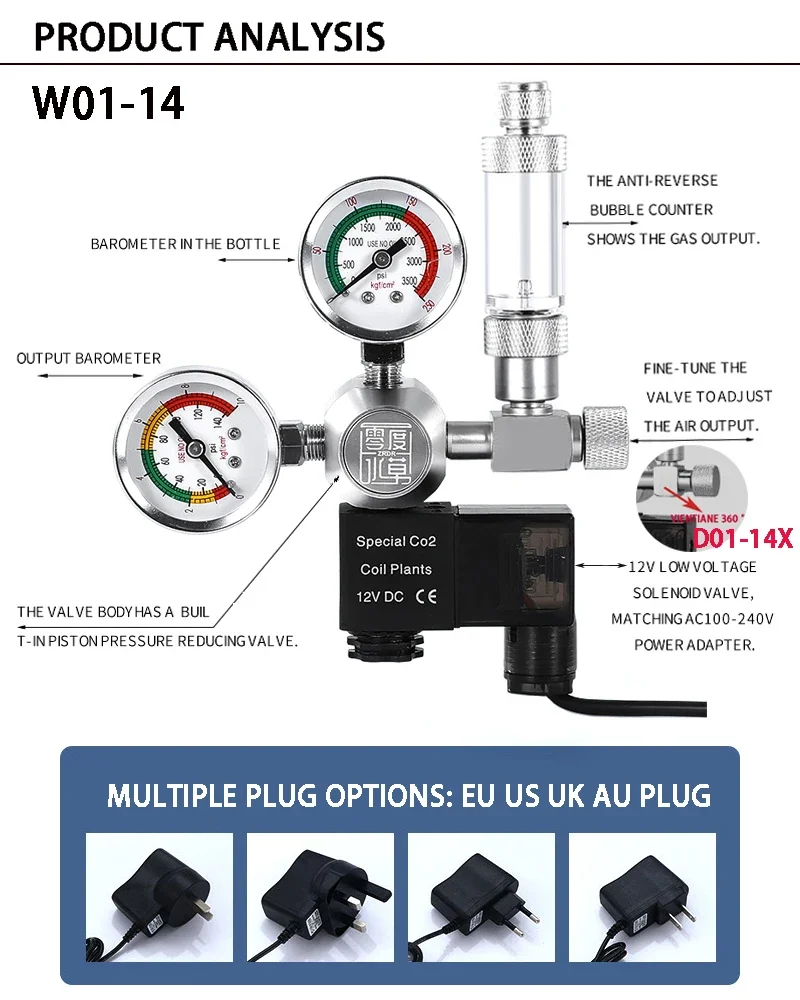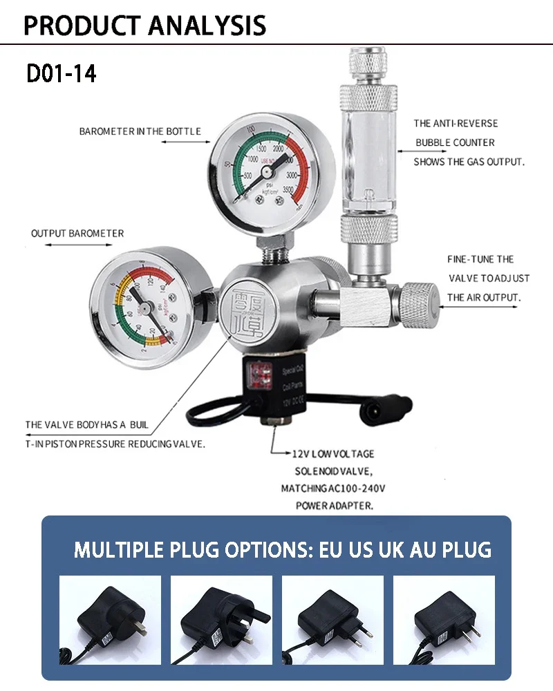 Material: aleación de aluminio + acero inoxidable 304Interfaz modelo/rosca: compatible con W21.8 G5-8 CGA320 M22Dimensión: como se muestra en la figuraFuente de alimentación: entrada AC100-240V Salida DC12V (versión global)Aplicable a fuente de alimentación AC110V-AC220VUtilizado directamente en países/regiones donde se utiliza una fuente de alimentación de 110 V o 220 V.Enchufe: enchufe UE/EE. UU./REINO UNIDO/AUHay tres estilos disponibles:1: D01-14: Diseño de válvula solenoide impermeable 100-240 V - válvula solenoide impermeable2: W01-14: válvula solenoide antigua clásica 100-240 V3: D01-14X: nuevo tipo de 100-240 V (contador de burbujas giratorio y ajustable, el puerto del cilindro también se puede usar hacia arribaNota: (compre el modelo de tuerca correspondiente para evitar el problema de la junta a tope de la tuerca)